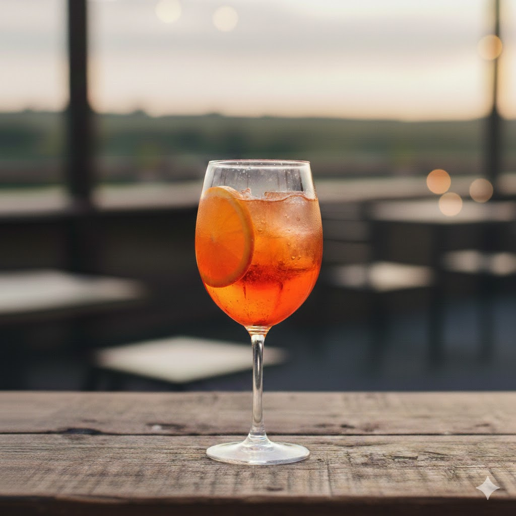 Recipe: 3oz Proseco, 2oz Aperol, 1oz Club Soda, All Over Ice, Garnish with Orange Slice.